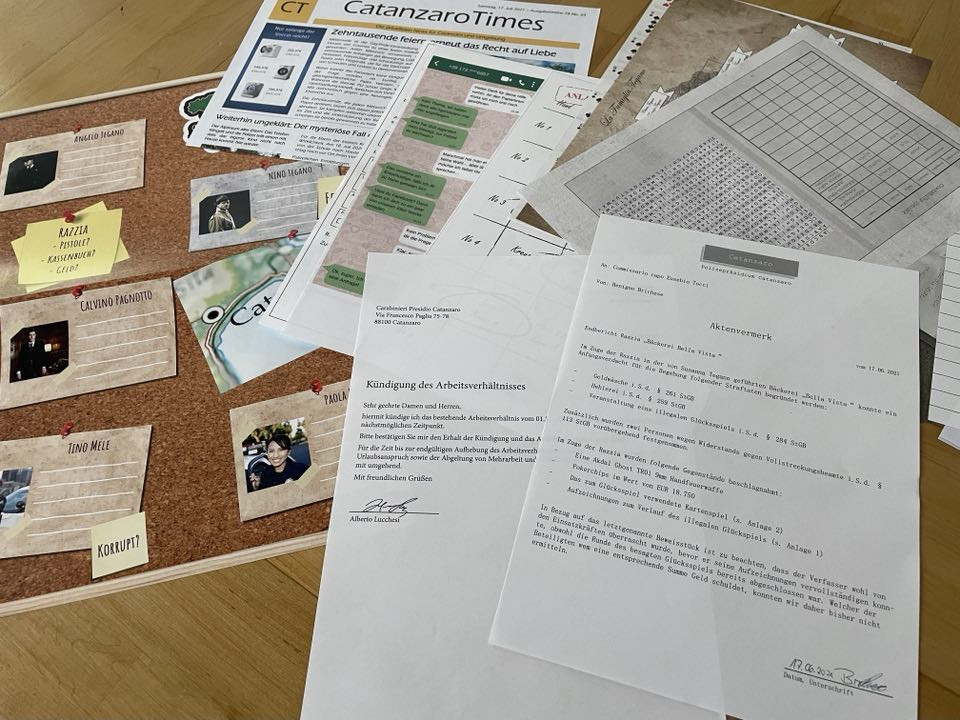 Wie bei den meisten Krimispielen wird auch hier nur ein etwas größerer DIN A4 Umschlag geliefert, in dem sich die ganzen Materialien für das Spiel befinden. Zu den Beweismitteln gehören eine Zeitung, verschiedene kleine und große Dokumente und ein Poster mit den Verdächtigen. Sobald alles auf einem großen Tisch verstreut ist, geht das Spiel auch schon los.