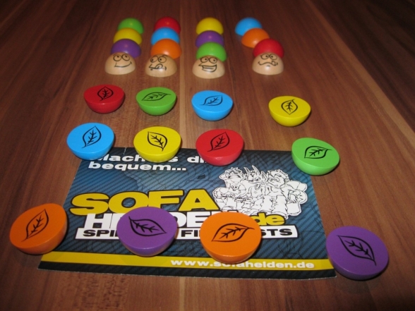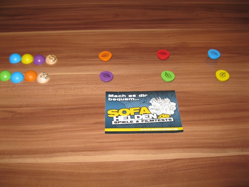 Die Verpackung von Flori Vielfraß ist recht klein. Auf der Front lächelt einem eine niedliche Raupen vor einem grünen Laubhintergrund entgegen. Auf der Rückseite ist comichaft eine Spielsituation abgebildet und eine kurze Beschreibung des Spiels. In der Verpackung ist nur ein Fach mit einem wiederverschließbaren Plastikbeutel, in dem das gesamte Spielmaterial aufbewahrt wird. Neben den drei Würfeln gibt es 24 Halbkugeln in 6 Farben, die gleichzeitig als Futter und Raupenteile fungieren. Vier weitere holzfarbene Halbkugeln dienen mit aufgemalten lustigen Gesichtern als Köpfe der Raupen. Das gesamte Spielmaterial ist aus Holz und damit robust und kinderfreundlich.