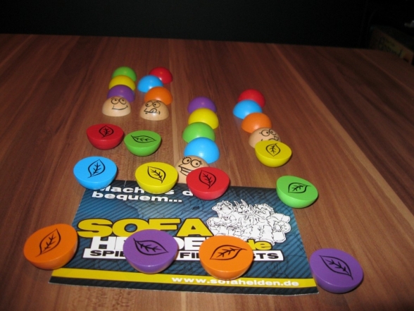 Spielt man mit jüngeren Spielern (so wie wir), gibt es noch eine vereinfachte Variante. Hierbei wird statt mit drei Würfeln nur mit einem geworfen. Der Spieler, der an der Reihe ist, würfelt so lange bis er die Farbe seines letzten Raupenteils trifft. Erscheint aber zwischenzeitlich eine Farbe der gegnerischen Raupenhintern, so dürfen diese ihre Raupen nach dem gewohnten Prinzip vorwärts ziehen.