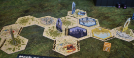 Nach der Bauphase folgt die Flugphase. Hierbei legt Ihr die Credits, Waren und Würfel bereit und den Spielplan in die Mitte. Dann nehmt Ihr Euch für jede Kabine zwei Astronauten, stellt sie darauf und verfahrt mit den Batterien ähnlich. Ihr nehmt Euch für jede aufgedruckte Batterie einen Energiemarker und legt Ihn auf das Plättchen.