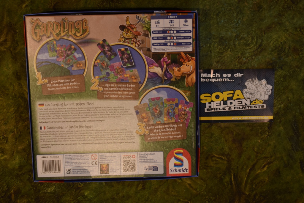 Für das Regelstudium von Gardlings müsst Ihr lediglich ein bis zwei Seiten der vierseitigen Anleitung lesen. Auf der letzten Seite findet Ihr noch Regeln zu der Profivariante, der Mini-Erweiterung mit Missionsplättchen und dem Solospiel. Insgesamt ist die Anleitung sehr gut geschrieben und einfach verständlich. Bei uns hat sie unser Zwölfjähriger gelesen und uns die Regeln anschließend erklärt.