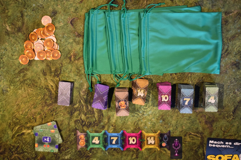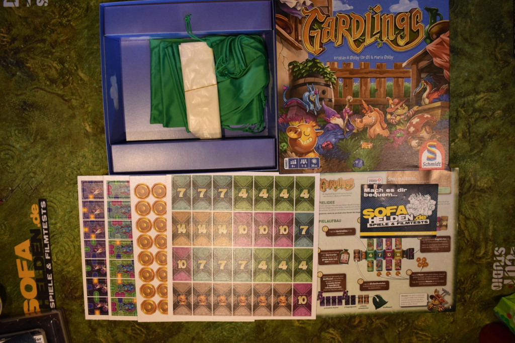 Passend zur Gartenthematik hat man bei Gardlings auf Plastik verzichtet. Neben dem Kernelement, den fünf Stoffbeuteln, gibt es noch ein paar Papierbeutel zum Verstauen des Spielmaterials. Dieses besteht selbst aus Karton und muss erst aus den vier Stanzbögen befreit werden. Die Materialstärke ist sehr gut gewählt und die Gestaltung ist sehr süß. Die namensgebenden Gardlings sehen gut und „frech“ aus, wohingegen die Gnome schon fast ein wenig bedrohlich dreinschauen. Nachdem Ihr ausgepöppelt habt, kann es auch schon an den Spielaufbau gehen.