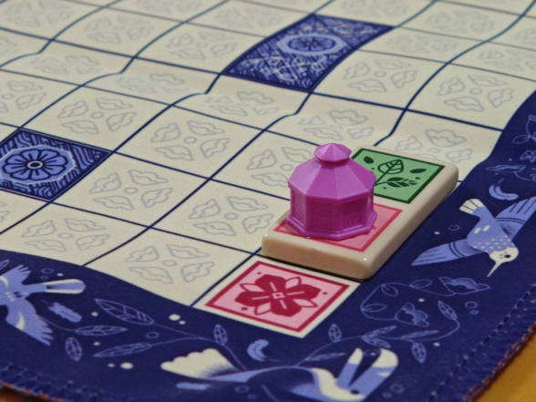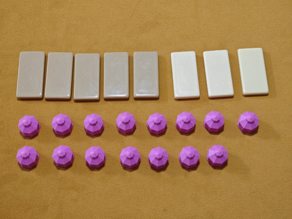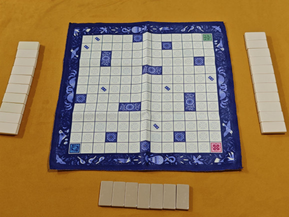 Der Spielplan ist übrigens doppelseitig. Beide Seiten zeigen verschiedene Anordnungen dieser Spielelemente, um Abwechslung zwischen den Partien zu ermöglichen. Der orangene Spielplan zeigt zusätzlich Felder mit Vasen, die beim Abdecken mit einem Domino einen weiteren Spielerzug ermöglichen. Zuletzt wird ein Startspieler ausgewählt. Dann geht es los.