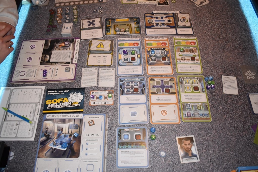 Der Spielaufbau nimmt nicht nur etwas Zeit in Anspruch, sondern auch sehr viel Platz auf dem Spieltisch. Dieser sollte schon relativ groß sein. Ein Vorteil ist aber auf jeden Fall, dass es kein starres Spielbrett gibt (was uns etwas verwundert hat), sondern man die einzelnen Räume des Raumschiffes auch dem Platz entsprechend anordnen könnte. Es gilt einige Kartenstapel zu mischen und zu platzieren und die Beziehungskarten an die Spieler zufällig auszuteilen. Anders als in ähnlichen Spielen gibt es keine Charakterkarten, sondern man ist ein namenloser Offizier, der in Beziehung zu einem Besatzungsmitglied steht. Passend zur Beziehungskarte erhält jeder Spieler noch das passende Wohnquartier und die Würfel. Dann wird ausgewürfelt, wer der Einsatzleiter ist, der daraufhin den entsprechenden Marker erhält. Nun werden noch die ersten Seiten des Plot-Buches gelesen und etwaige Hinweise zum Spielaufbau befolgt. Außerdem dürfen sich die Spieler noch die Namen ihrer Offiziere und des Schiffes ausdenken und diese im Logbuch eintragen. Letzteres dient auch der Erfassung des Spielstandes. Aber erst einmal sollten wir anfangen zu spielen…