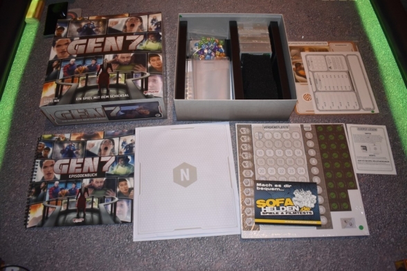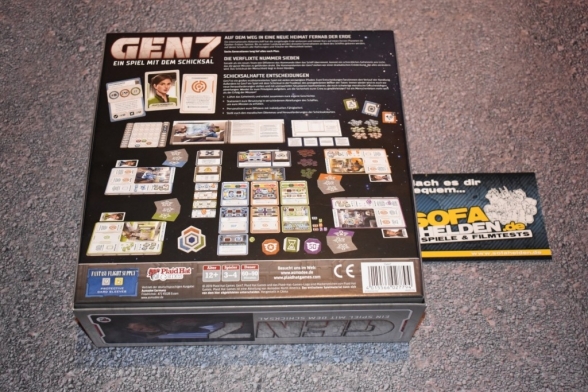 Der erste Eindruck zu Gen7 ist schon einmal sehr gut. Die Verpackung ist von oben bis unten vollgepackt. Neben einigen Karten, Würfeln und Stanzbögen gibt es noch mysteriöse Umschläge in der Verpackung. Etwas negativ könnte man aus der Sicht des Umweltschutzes bewerten, dass die Stanzbögen in Folie eingeschweißt sind. Insgesamt weiß das Spielmaterial aber zu überzeugen. Nach dem Rauspöppeln haben wir die größeren Spielplanteile unter die Lupe genommen. Diese sind nicht nur beidseitig bedruckt, sodass man beide Seiten verwenden könnte, sondern fassen sich auch unheimlich angenehm an. Sie haben eine schwer zu beschreibende Beschichtung, die sie sehr „griffig“ wirken lassen. Bevor es an den eigentlichen Spielaufbau geht, weist einen ein beiliegender Zettel noch darauf hin, die Karten zu sortieren. Um die Sortierung beizubehalten, liegen dem Spiel einige Sortierkarten sowie zwei Schaumstoffblöcke bei, die die Karten in der Schachtel an Ort und Stelle halten sollen.