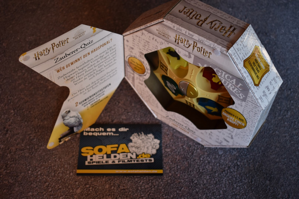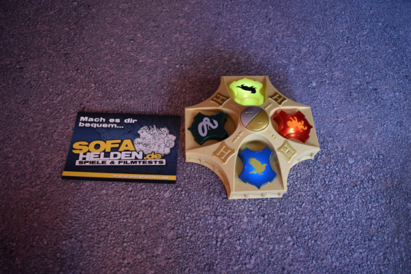 Nunja, das Spielmaterial zum Harry Potter Zauberer-Quiz ist sehr übersichtlich. Man macht den Karton auf und findet eine Anleitung und den, nennen wir es Quizmaster, vor. Insgesamt hat das Gerät zwar ein relativ robustes Gehäuse, die Bedienelemente wirken aber leider nicht sehr langlebig und stabil. Gerade bei einem Quiz, bei dem die Wappen als Buzzer missbraucht werden, sollten diese besonders robust sein. Zum Spielaufbau gibt es nicht viel zu sagen, Spiel in die Mitte stellen, anschalten, fertig.