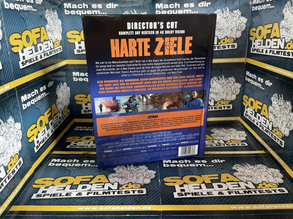 Das Mediabook zeigt das klassische blaue Cover, das zwar schlicht ist, aber besonders bei Fans der Ursprungsveröffentlichung beliebt ist. Auf der Vorderseite befindet sich ein Pfeil mit Van Dammes Gesicht, darüber sein Name, darunter der Filmtitel – mehr nicht. Auf der Rückseite sind Szenenfotos sowie alle Film- und Veröffentlichungsdetails direkt aufgedruckt, es gibt keine separate J-Card. Innen enthält das Set ein 22-seitiges Booklet von Oliver Nöding, den Film auf Blu-ray und 4K sowie eine Bonus-Blu-ray mit Extras. Cover & Bilder © 2025 PLAION PICTURES / Produktfotos: www.sofahelden.de Das Fazit von: Panikmike
