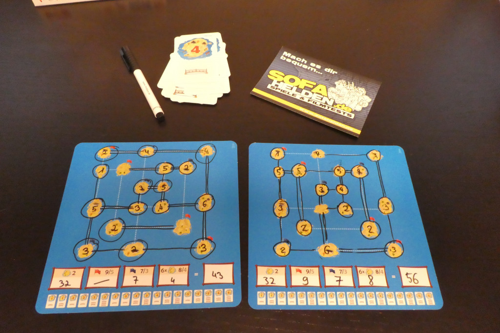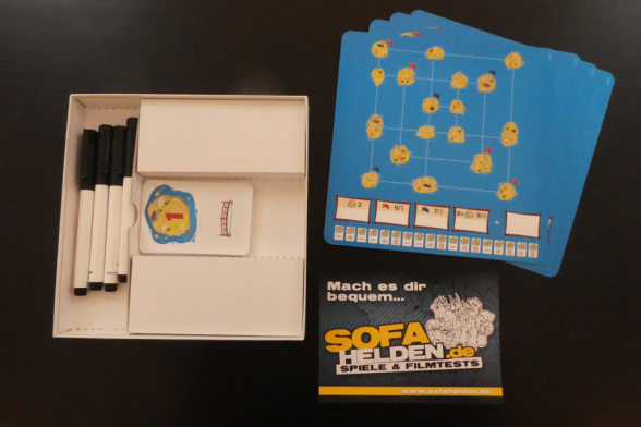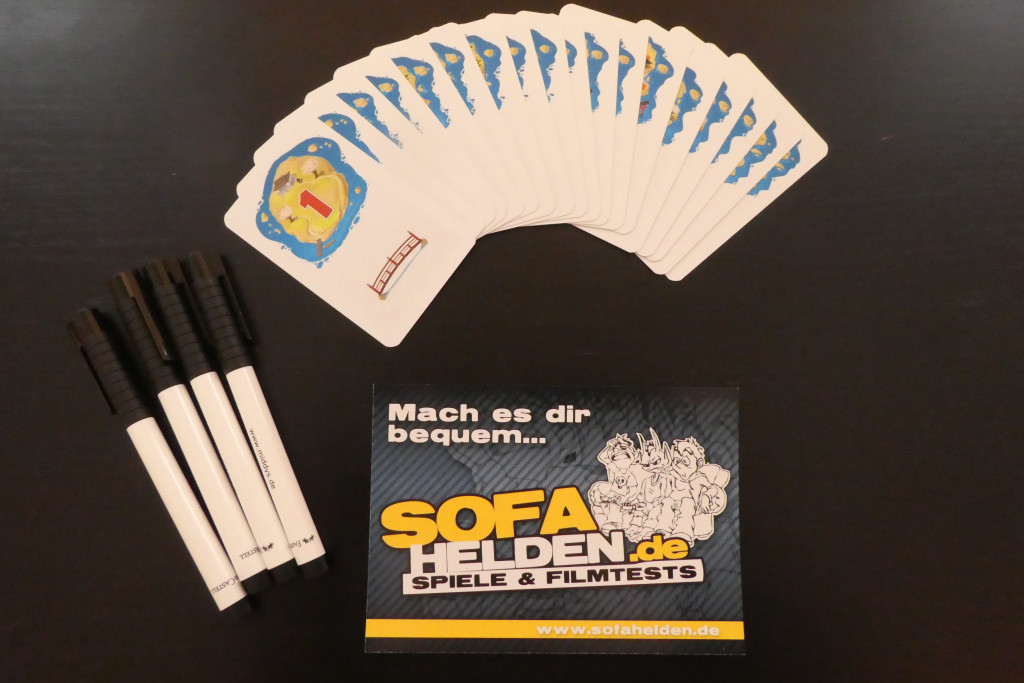 Das Material ist einfach gehalten. Die vier Spielpläne sind beidseitig bedruckt, betitelt mit Seite A und Seite B. Somit stehen den Spielern zwei mögliche Ausgangsarchipels zur Verfügung. Außerdem sind vier Whiteboard-Marker beigelegt, für jeden Spieler ein Stift. Diese lassen sich von den beschichteten Spielplänen mit einem trockenen Tuch einfach abwischen, sodass die Spielpläne für eine weitere Partie weiterverwendet werden können. Die achtzehn Spielkarten finden in der niedrigen Kiste ebenfalls Platz.