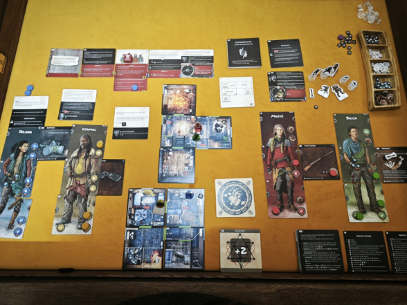 Heredity besteht hauptsächlich aus viereckigen, durchnummerierten Karten, die den gesamten Spielverlauf steuern. So gibt es zum Beispiel Geländekarten, auf denen man seine Charaktere bewegt, Gegenstandskarten, die ausgerüstet werden können und besondere Fähigkeiten verleihen und Zeitleistenkarten, welche den zeitlichen Ablauf von Ereignissen steuern. Hinzu kommen Papp-Aufsteller mit Plastik-Füßchen, einige Pappmarker und Aktionsscheiben aus Holz in den vier Spielerfarben. Das Spielmaterial lässt sich in keiner Weise als besonders hochwertig oder umfangreich bezeichnen. Das ist nicht die Kategorie, in der Heredity glänzt. Aber das Material ist vollkommen ausreichend, um in die Geschichte einzutauchen und für ein immersives Spielerlebnis zu sorgen. Man hätte Heredity mit Miniaturen aufblähen können und so sicher UVP sowie Platzbedarf im Regal mehr als verdoppelt. Wir sind froh, dass hier „nur“ die Papp-Aufsteller zum Einsatz kommen.