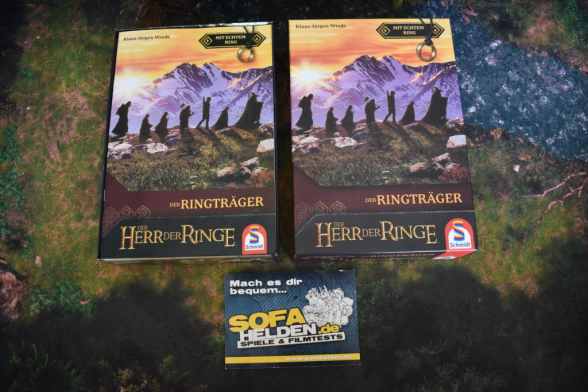 Schon bei einem ersten Blick auf der Spielwarenmesse Nürnberg 2024 war der Ring ein besonderes Highlight. Er sieht gut aus und ist sogar aus Metall, also wirklich ein echter Ring. Hinzu kommen ein Kartenstapel mit einer Banderole, die Figurenfüße in Papier verpackt und drei Stanzbögen mit den Figuren und Geländeteilen. Für das erste Spiel müsst Ihr also erst einmal die Geländeteile und Figuren auspöppeln und letztere mit den Standfüßen versehen.