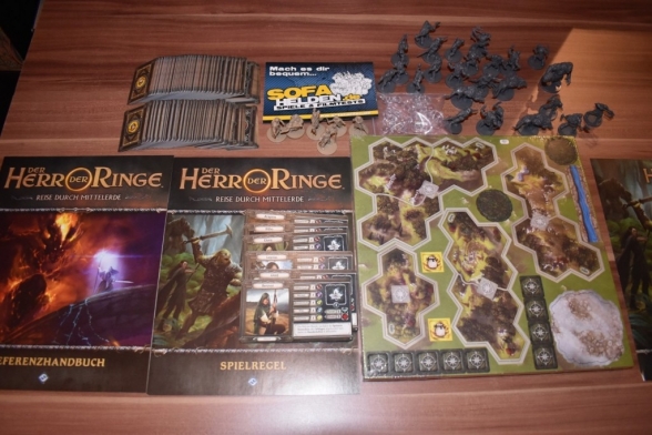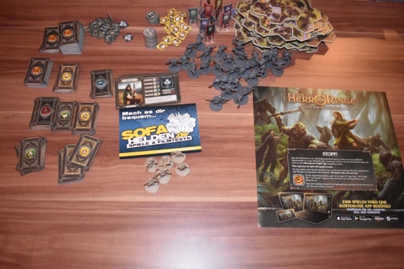 Schon am Gewicht der Verpackung von Der Herr der Ringe: Reise durch Mittelerde erkennt man, dass es das Spiel in sich hat. Im Inneren der Verpackung befinden sich zahlreiche Spielplanteile, die logisch durchnummeriert sind. Das bedeutet zum Beispiel, dass alle Planteile, die mit einer Eins beginnen auch ein Feld groß sind, die mit einer Zwei zwei Felder und so weiter. Außerdem sind sie beidseitig bedruckt, haben also eine Seite A und eine Seite B. Hinzu kommen über einhundert Karten und sehr viele Spielmarker aus Karton. Das Highlight sind aber die Kunststofffiguren, von denen sechs die Helden und fünfundzwanzig die Gegner darstellen. Die Verarbeitung dieser Figuren ist sehr gut und sie wirken, trotz einiger Details wie relativ dünner Schwerter, sehr robust. Insgesamt kann man also schon mal sagen, dass das Spielmaterial sein Geld wert ist. Um das Spiel aber spielen zu können, benötigt man zwingend ein Tablet oder ein Notebook. Auf der Seite von Asmodee findet man für die App Links zum Google Play Store, Apple Store und Steam. Somit hat man eine breite Auswahl an verfügbaren Plattformen. Aufgrund des Umfangs der App und dem Stellenwert im Spiel, raten wir von einem Spiel mit dem Smartphone ab, ein Laptop oder Tablet mit größerem Display ist schon Pflicht.