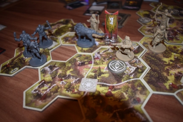 Am Ende folgt die Erholungsphase. Dabei mischt als erstes jeder Spieler seinen Ablagestapel in seinen Nachziehstapel. Anschließend können die Spieler eine neue Fertigkeit bereitmachen. Das geschieht über „Kundschaften 2“. Dabei ziehen die Spieler jeweils zwei Karten und wählen sich eine davon aus, um sie unter ihrer Charakterkarte offen hinzulegen und somit bereit zu machen. Ist eine Karte bereit, kann sie jederzeit zum aufgedruckten Ereignis eingesetzt werden (zum Beispiel als Bonus bei einem Kampf). Die zweite Karte wird entweder unter oder auf den Nachziehstapel gelegt. Dabei ist die Wahl nicht einfach, denn (fast) jede Karte hat einen Effekt und gute Karten meistens oben links noch ein Erfolgssymbol. So muss man sich entscheiden, ob man zum Beispiel die Karte ohne Erfolgssymbol als Fertigkeit bereit macht und die Karte, die vielleicht besser wäre, aber ein Erfolgssymbol hat, lieber verdeckt auf seinen Nachziehstapel für die nächste Probe legt oder umgekehrt. Im Anschluss folgt wieder die Aktionsphase und die Spieler dürfen wieder in beliebiger Reihenfolge ihre Helden aktivieren und ihre Aktionen durchführen.
