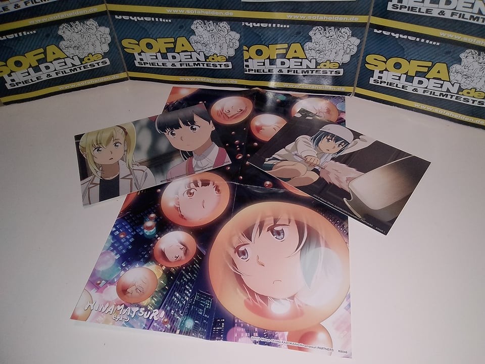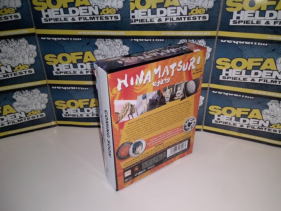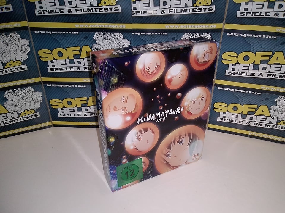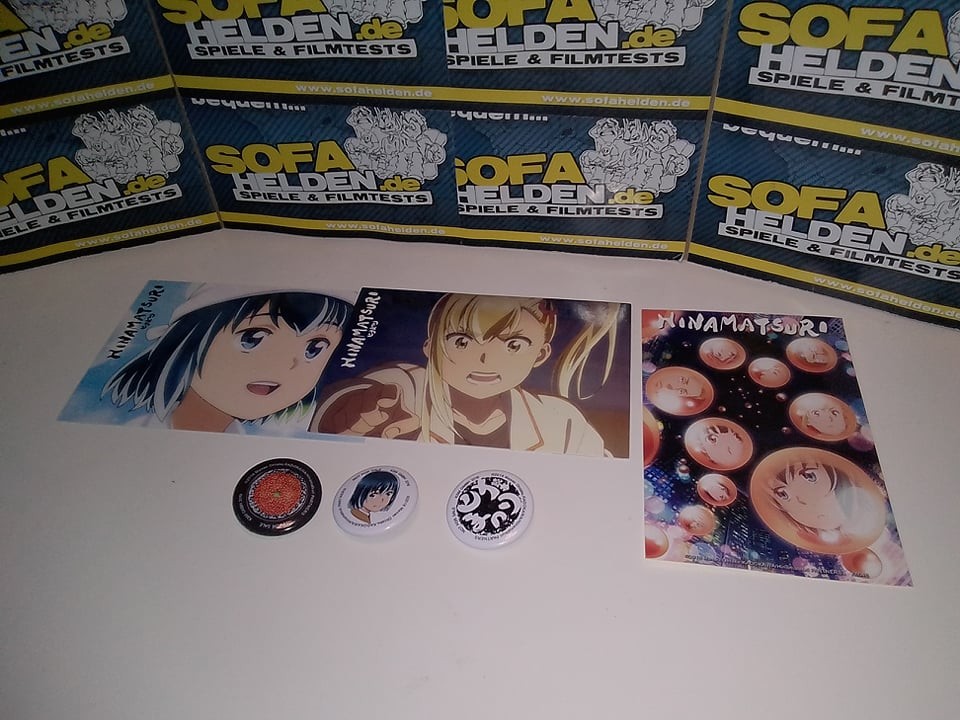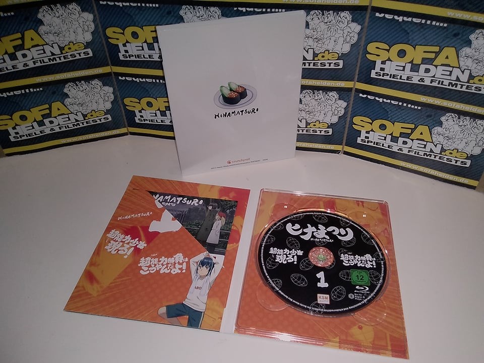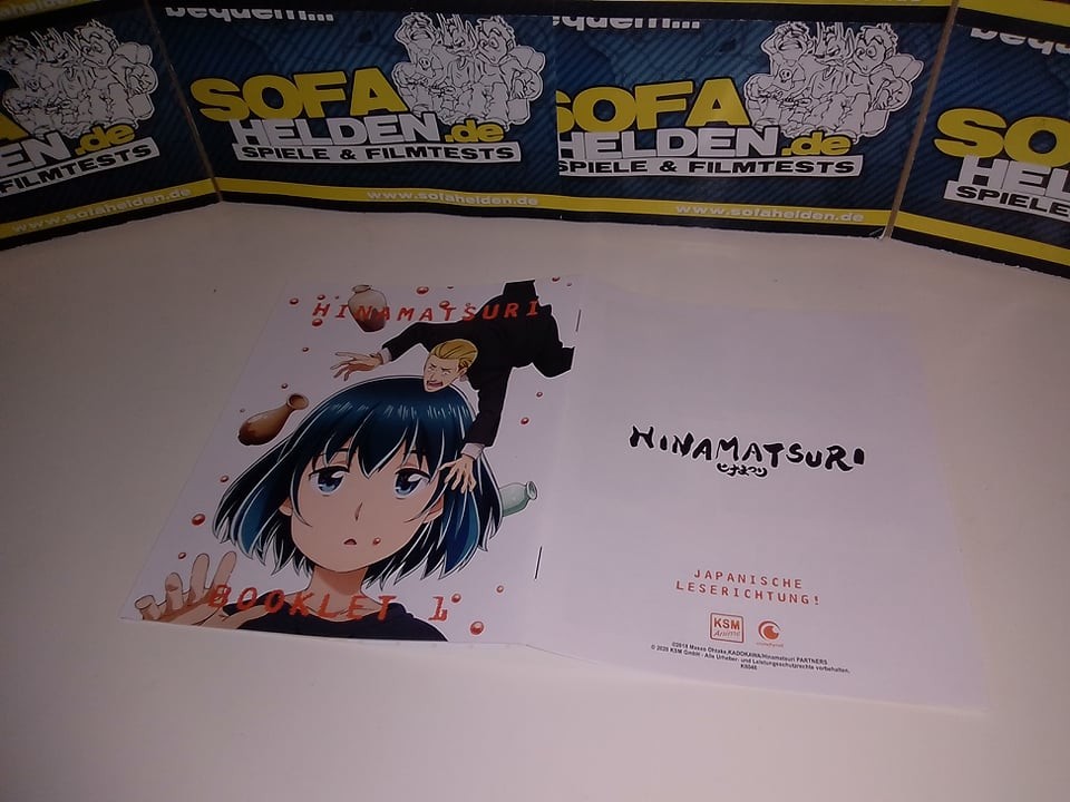 Die erste Volume von Hinamatsuri erscheint als Digipak im Sammelschuber, der Platz für die noch kommenden beiden Volumes lässt. Der Sammelschuber ist aus festem Karton und zeigt auf dem Frontcover die Gesichter der Hauptcharaktere in Seifenblasen vor einer nächtlichen Skyline, während die Rückseite wie üblich die Inhaltsangaben sowie Details zur Volume liefert. Hier findet man auch eine Zusammenfassung des extrem umfangreichen Bonusmaterials, das KSM Anime zusammen mit der ersten Volume liefert. Die Volume selbst befindet sich in einem Digipak im Schuber, welche beide jeweils ein Motiv von Nitta und Hina zeigen. Das 40-seitige Booklet bietet nicht nur einen ausführlichen Episodenguide, sondern auch diverse Hintergrundinfos zu Figuren, Locations und anderen Inhalten der Serie. Die übrigen Gimmicks befinden sich im Platzhalter des Sammelschubers und umfassen drei Ansteck-Buttons, zwei Wende-Postkarten, ein Wende-Poster sowie einen Stickerbogen. Letztere zeigen beide das Seifenblasen-Covermotiv. Eine Edition, die für den Fan eigentlich keine Wünsche offenlässt.