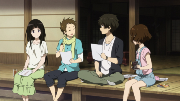 Hyouka verbindet Slice-of-Life und Schulalltag auf äußerst unterhaltsame Art und Weise mit klassischen Kriminalgeschichten, und garniert das Ganze zusätzlich mit einem Hauch von Romance und Comedy. Dabei ist der Name der Serie ein wenig irreführend, denn anstatt sich einer fortlaufenden, umfassenden Geschichte zu widmen, nimmt das Rätsel um das namensgebende Buch der Klassik-Klubs nur einen kleinen Teil der Handlung ein, und bildet damit grundsätzlich lediglich den Grundstein für alles, was folgen wird. Bereits die ersten Episoden zeigen deutlich auf, dass man es als Zuschauer hier mit den unterschiedlichsten Mysterien zu tun bekommt, die vom Klassik-Klub in guter alter Detektiv-Manier gelöst werden. Diese umfassen allerdings meist kleine, unscheinbare Momentaufnahmen innerhalb des Schulalltags, wie beispielsweise eine Verwechslung des Unterrichtsstoffs, eine verschlossene Klassenzimmertür, oder auch die Suche nach einem verschwundenen Buch. Im Mittelpunkt steht dabei auf der einen Seite die stets fröhliche und energiegeladene Eru Chitanda, die einfach nicht genug von rätselhaften Herausforderungen bekommen kann. Ihr gegenüber steht auf der anderen Seite der zurückhaltende, stets im Energiesparmodus agierende Houtaro Oreki, hinter dessen teilnahmsloser Fassade ein wahres Kombinationsgenie schlummert, das selbst dem berühmten Sherlock Holmes Konkurrenz machen könnte. Gerade die Dynamik, die durch diese extrem unterschiedlichen Charaktere erzeugt wird, macht bereits eine Menge Spaß, wobei sich beide Figuren hervorragend ergänzen. Dagegen wirken die anderen beiden Mitglieder des Klassik-Clubs wie austauschbare Sidekicks, die abgesehen von einigen humorvollen Momenten kaum etwas zur eigentlichen Handlung beitragen können. Wer allerdings hofft, bei den zahlreichen Rätseln seine eigene Fantasie einsetzen zu können, oder sich gar wie in anderen Crime-Serien an deren Lösung zu versuchen, der dürfte zweifellos enttäuscht werden, denn die Schlussfolgerungen und Auflösungen in Hyouka sind zwar stets unterhaltsam und interessant, jedoch mangels Informationen und Hintergründen eigentlich nie vorherzusehen. Nach dem bisher größten Fall um das titelgebende Buch "Hyouka", und der daraus resultierenden Charakterentwicklung der Hauptfiguren, wird es wohl durchaus spannend zu sehen, ob sich die Serie ab jetzt mit vielen kleinen, banalen Rätseln begnügen wird, oder ob im Verlauf noch weitere größere Handlungsstränge ihren Weg in die Erzählung finden werden.