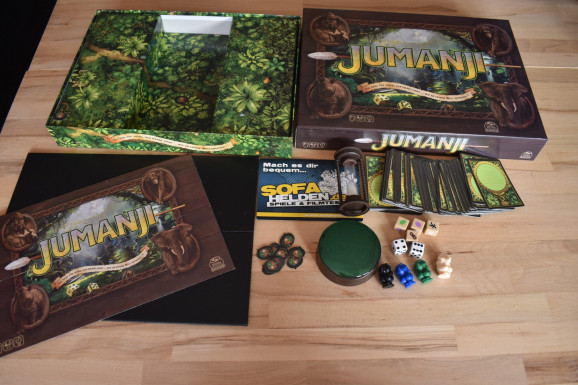 Die Verpackung von Jumanji wirkt schon einmal sehr wertig. Er ist glänzend und hat eine sehr glatte Beschichtung. Im Inneren findet man die Anleitung und den Spielplan in der Jumanji-typischen Faltung vor. Zusätzlich gibt es einen Stanzbogen mit den Lebensmarkern, einen Haufen Karten und einige Würfel. Zwei Würfel sind normale W6, die anderen vier sind mit Symbolen für die Challenges versehen. Für die bekannte Mitte, quasi das Auge von Jumanji, gibt es eine grüne Kuppel aus Kunststoff, die die Rätsel auf der Kartenvorderseite sichtbar macht. Diese sind mit einem grünen Muster versehen, sodass man sie mit bloßem Auge (fast) nicht lesen kann. Außerdem gibt es noch vier schicke Spielfiguren aus Kunststoff.