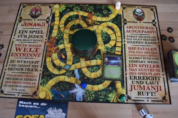 Die Regeln zu Jumanji sind sehr einfach, im Grunde genommen ein Würfelspiel, bei dem man nach jedem Zug Karten ziehen und deren Text erfüllen muss. Somit ist auch die Anleitung sehr übersichtlich. Wichtig ist noch die Rückseite der Anleitung, auf der die möglichen Lösungen der Rätsel abgebildet sind. Dabei geht es um viele Filmbegriffe wie Stampede, Monsun und viele weitere.