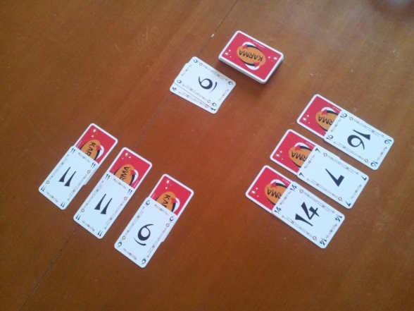 Wer an der Reihe ist muss eine Karte ausspielen. Dabei dürfen solange man noch Karten auf der Hand hat nur diese verwendet werden und die ausgespielte Karte muss im Wert stets gleich oder höher als die Karte sein, die sich bereits auf dem Ablagestapel befindet. Es ist möglich, mehrere Karten mit demselben Wert gleichzeitig auszuspielen. Die "Karma-Karten" dürfen immer gespielt werden und haben jeweils Sonderaktionen zur Folge, auf welche ich später noch näher eingehen werde. Kann ein Spieler keine Karte spielen, so muss er den kompletten Ablagestapel aufnehmen, wurden eine oder mehrere Karten gespielt muss der Spieler nachziehen, bis er wieder drei Karten auf der Hand hat. Wurden nacheinander drei gleichwertige Karten ausgespielt, wird der gesamte Ablagestapel beiseitegelegt und fällt dadurch aus dem Spiel.