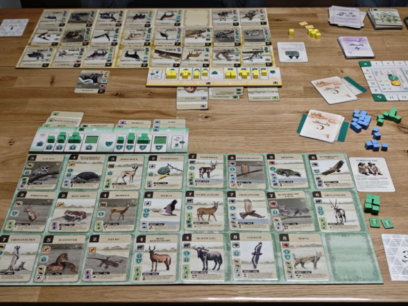 Neben den Karten, die gedraftet werden, gibt es noch drei weitere Kartendecks, die separat gemischt und als Nachziehstapel bereitgelegt werden müssen: die Forschungsaufgaben, aufgeteilt in drei Decks, eines für jede Runde (1-3). In die Tischmitte kommt der Spielplan. Er enthält neben der Siegpunkteleiste auch Platz für vier Karten mit Forschungsaufgaben. In der ersten Runde werden vier Forschungsaufgaben aus dem Kartendeck für Runde 1 offen ausgelegt. Der Spielplan zeigt auch eine Leiste für den Klimaschutz. Hier können alle Spieler im Spielverlauf Geldmarker platzieren, um die Klimaschutzstufe zu erhöhen, welche Voraussetzung für das Ausspielen bestimmter Tiere darstellen kann.