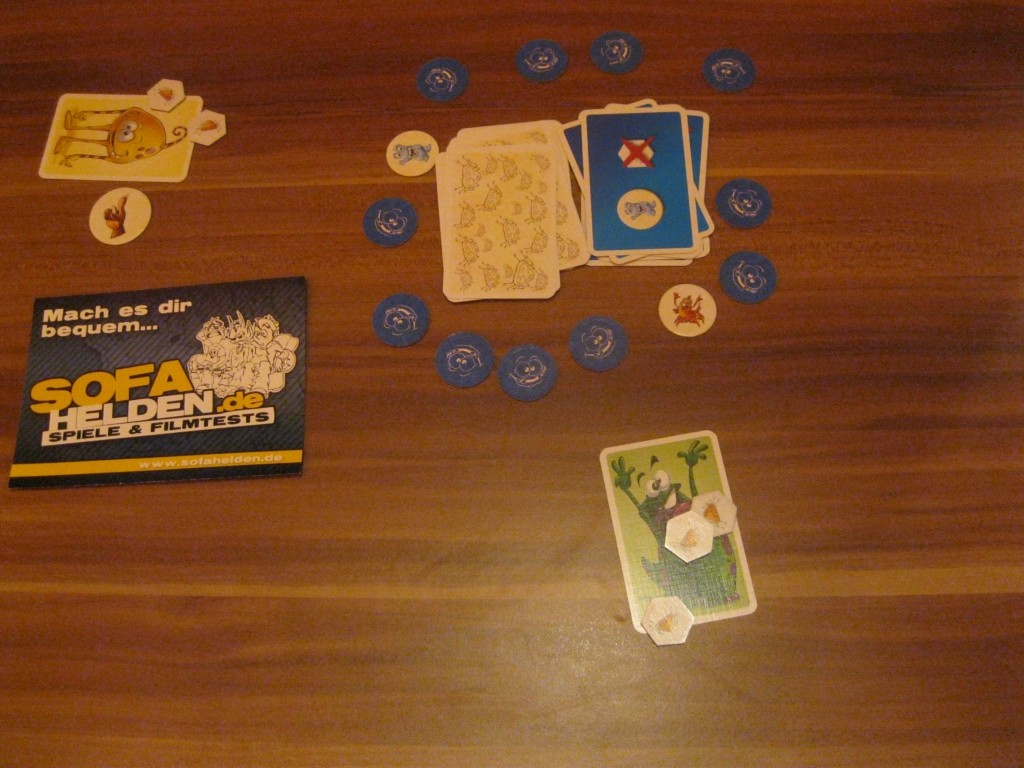 Nachdem auch die Karten ausgepackt sind, kann es an den eigentlichen Spielaufbau gehen. Jeder Spieler sucht sich zuerst eine der vier Monsterkarten aus und legt sie vor sich hin. Anschließend erhält er je nach Spieleranzahl von zwei, drei oder vier Spielern die entsprechende Krabbleranzahl von zehn, sieben oder fünf „Krabbler“-Chips. Diese legen die Spieler jeweils auf die Monsterkarte. In der Mitte des Tisches wird ein verdeckter Stapel der gemischten Aktionskarten platziert. Drumherum werden in einem Kreis die ebenfalls gemischten „Monster“-Chips verdeckt platziert. Hierbei sollte man darauf achten, dass neben dem Kartenstapel noch Platz für einen Ablagestapel vorhanden ist. Die restlichen „Krabbler“-Chips dienen als Vorrat und werden auf die Seite gelegt. Nun darf der frechste Spieler beginnen und erhält den „Ich bin dran!“-Chip.