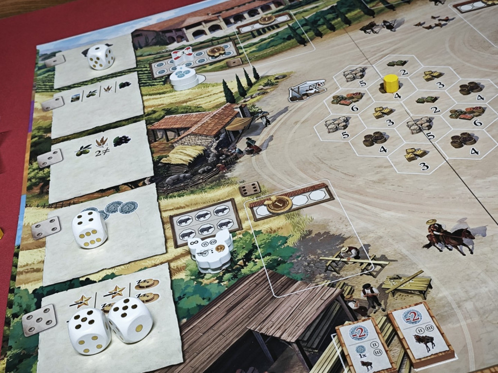 Silber wird aus dem Vorrat genommen und neben dem Hoftableau platziert. Erntegüter werden mit Spielermarkern auf dem Hoftableau markiert. Und Ressourcen aufwerten bedeutet einen bereits platzierten Spielermarker auf ein anderes Feld des Hoftableaus zu verschieben, wobei Oliven und Getreide zu Nahrung, Trauben zu Wein und Schweine zu Fleisch verarbeitet werden können.