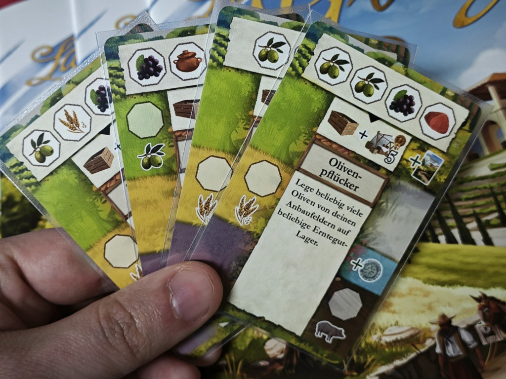 Nun nimmt sich jeder Spieler ein Hoftableau. Das Hoftableau hat an allen vier Seiten unten Aussparungen für Karten. Denn Karten können links, rechts, unten und oben unter das Hoftableau geschoben werden und erfüllen je nach Position einen anderen Zweck. Jede Karte im Spiel hat also erstmal vier Eigenschaften. Welche Du nutzt, ist dir überlassen. Auf der linken Seite des Bauernhofs fungieren Hofkarten als Anbaufelder und generieren in der Einkommensphase neue Erntegüter (Oliven, Getreide oder Trauben). Rechts gespielte Karten dienen als Hofausbau und bieten mehrere Vorteile, wie zusätzliches Einkommen in Silber, ein größeres Handkartenlimit, mehr Lieferungsmöglichkeiten und mehr Platz für Schweine. Im oberen Bereich des Hoftableaus werden gespielte Karten zu Hofkarren. Diese zeigen zwei bis fünf Hofgüter, mit denen sie im Spielverlauf für Siegpunkte beliefert werden wollen. Und im unteren Bereich des Hoftableaus werden Hofkarten zu Hilfskräften, die permanente Fähigkeiten vermitteln, welche während der restlichen Partie aktiv sind. Zusätzlich enthält das Hoftableau Aussparungen für Plättchen, die man bei vollständiger Belieferung von Handwerksgebäuden im Dorf als Belohnung erhält und ebenfalls Einkommen und wiederkehrende Boni geben.