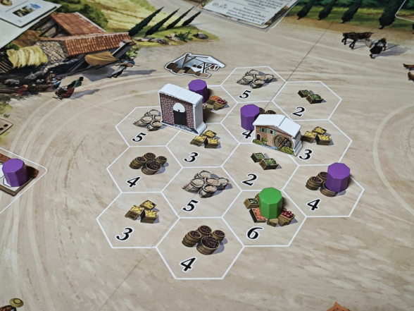 In Schritt 2 der Transportphase wandert dann jeder entsprechend seines Eselsplättchens auf der Siesta Leiste hoch. Dann wird die neue Spielerreihenfolge bestimmt und die Spielerreihenfolge Marker entsprechend neu verteilt. In Schritt 3 der Transportphase tätigen alle Spieler in der neuen Spielerreihenfolge Lieferungen, und zwar so viele wie auf dem gespielten Eselsplättchen angegeben. Eine Lieferung besteht immer darin eine Ressource (Erntegüter wie Oliven, Getreide und Trauben; Aufgewertete Hofgüter wie Nahrung, Wein und Fleisch; Schweine und Silber) abzugeben und einen Spielermarker auf das belieferte Feld zu stellen. Beliefert werden können Handwerksgebäude auf dem Spielplan sowie Marktkarren auf Hofkarten oberhalb des persönlichen Hoftableaus. Diese zeigen immer mehrere, zwei bis sechs Bedarfsfelder mit verschiedenen Ressourcen. Nur diese können an das entsprechende Gebäude bzw. den Karren geliefert werden, also gut vorausplanen! Wenn ein Spieler alle Bedarfsfelder mit seinen Spielermarkern bedeckt hat, gilt das Handwerksgebäude oder der Marktkarren als vollständig beliefert und es gibt eine Belohnung! Marktkarren und Handwerksgebäude bieten hier ganz andere Optionen und Vorteile.