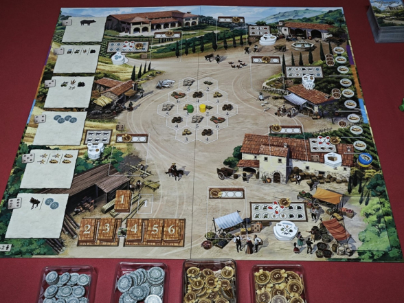 Alle Spieler bekommen nun 25 persönliche Spielermarker in der Spielerfarbe. Diese Marker dienen als universelle Ressource und können Handelsgüter, Oliven, Getreide, Trauben, Wein, Nahrung, Fleisch oder Schwein sein, je nach Position auf dem Hoftableau. Außerdem nimmt sich jeder Spieler ein Set aus vier Eselsplättchen, mit denen in der Transportphase zum einen blind um die Zugreihenfolge geboten wird, zum anderen festgelegt wird, wie viele Lieferungen man ausführen darf. Zuletzt erhalten alle Spieler eine Spielübersicht aus dicker Pappe, ein Silber und ein Siegpunkt, denn Siegpunkte sind manchmal auch Ressource, mit denen starke Sonderfähigkeiten ausgelöst werden können. Jeder Spieler zieht dann seine Starthand aus fünf Hofkarten.