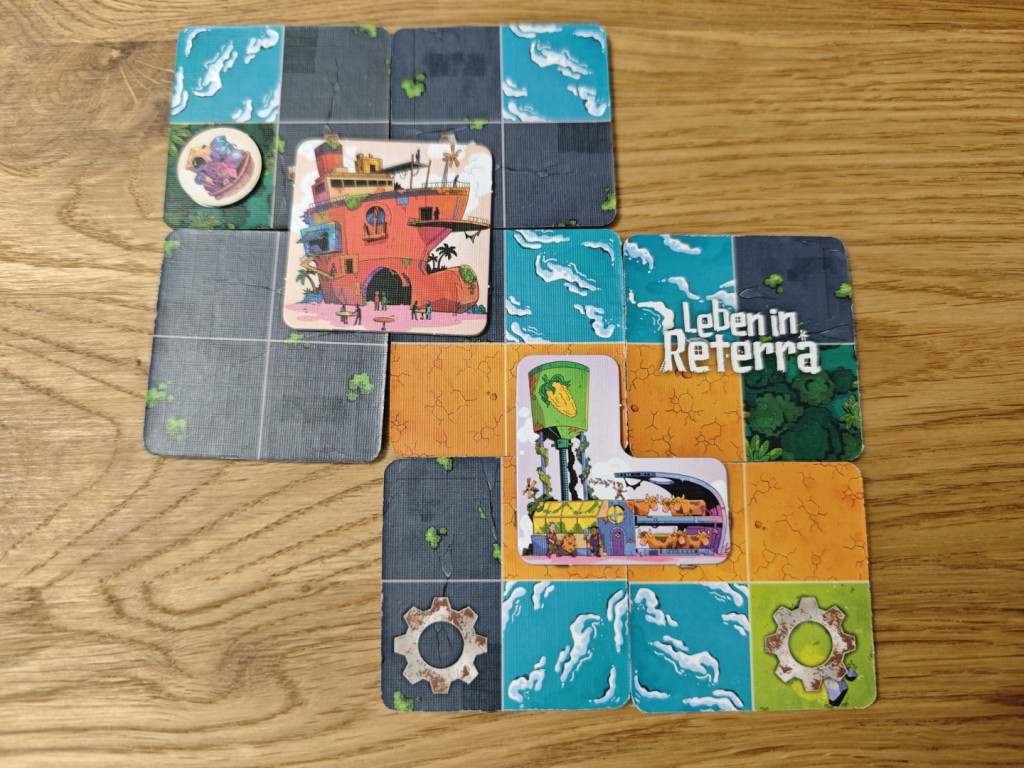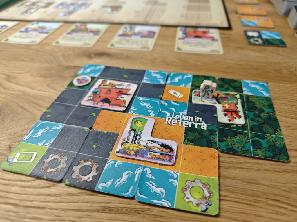 Außerdem wird man versuchen Zahnrad-Symbole auf identischen Terrains benachbart zueinander zu platzieren. Von Zahnrad-Symbolen hatten wir es noch nicht, weil sie an sich keine Siegpunkte geben. Aber nur auf Feldern mit Zahnrad-Symbolen können Gebäude-Plättchen gebaut werden; Und zwar auch nur dann, wenn sich alle Zahnrad-Symbole, die von einem Gebäude-Plättchen überbaut werden sollen, auf identischem Terrain, z.B. Wiese, befinden. Hier wird der Puzzle-Charakter von Leben in Reterra deutlich.