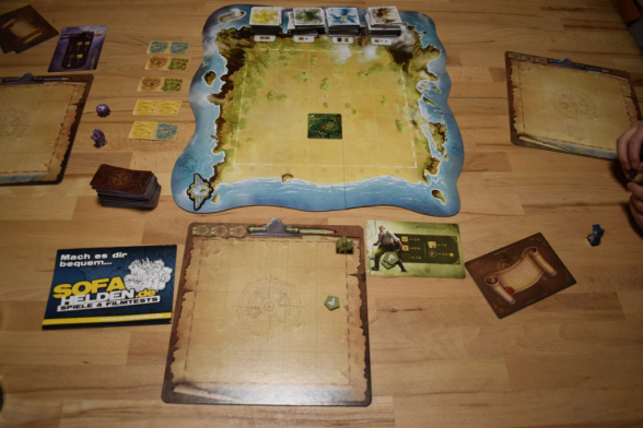 Nachdem die Plättchen aus den Stanzbögen herausgetrennt und die Karten ausgepackt sind, kann es auch schon an den Spielaufbau gehen. Hierfür wählt Ihr Euch jeweils eine Farbe aus und nehmt das Klemmbrett zusammen mit den passenden Holzmarkern, einer Übersichtskarte und die Figuren. Außerdem legt Ihr das Spielbrett in die Tischmitte und müsst darauf achten, dass Ihr Euer eigenes Klemmbrett genauso positioniert wie die große Karte auf dem Spielplan. Im oberen Teil des Spielplans legt ihr die vier Stapel der Geländekarten mit der Nebelseite nach oben bereit. Die Skizzenkarten mischt Ihr und deckt fünf von Ihnen auf. Die übrigen werden als Nachziehstapel bereitgelegt. Die Vermutungskarten werden ebenfalls gemischt und je zwei verdeckt an Euch ausgeteilt. Dann kann das Spiel auch schon losgehen.