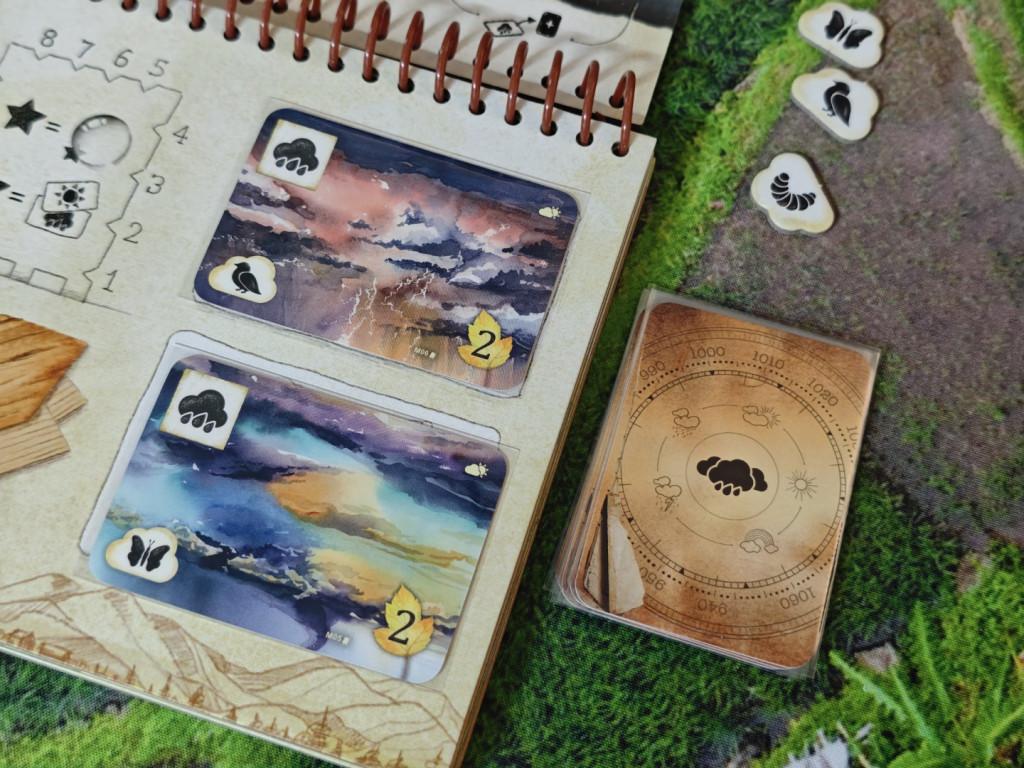 Wetterkarten können dann, wie alle anderen Karten auch, ausgespielt werden. Sie kommen immer unter eine bereits ausliegende Landschaftskarte – das ist ein Kartentyp, den wir oben in der Kurzeinführung gar nicht erwähnt haben. Landschaftskarten werden separat von den Bodenkarten und den darauf zu platzierenden Beobachtungskarten mit den Tier- und Pflanzen-Symbolen ausgespielt. Wetterkarten geben Siegpunkte und Einmalaktionen, sobald man diese ausspielt. Diese Einmalaktionen sind zum Teil aus denen des Grundspiels bekannt, z.B. Karten spielen, ziehen oder nehmen. Zum Teil kann man aber auch neue Plättchen erhalten, die man auf bereits ausliegende Karten platzieren kann, um mehr Symbole zu erhalten; so werden leichter Voraussetzungen für das Spielen anderer Karten erreicht.