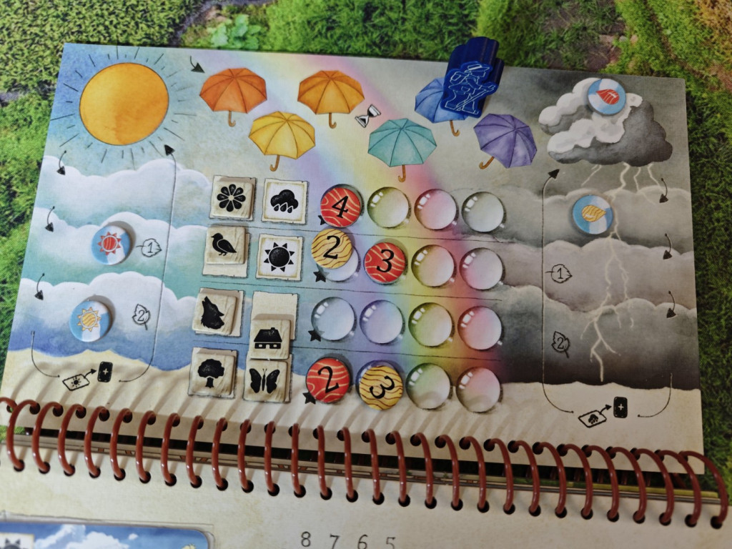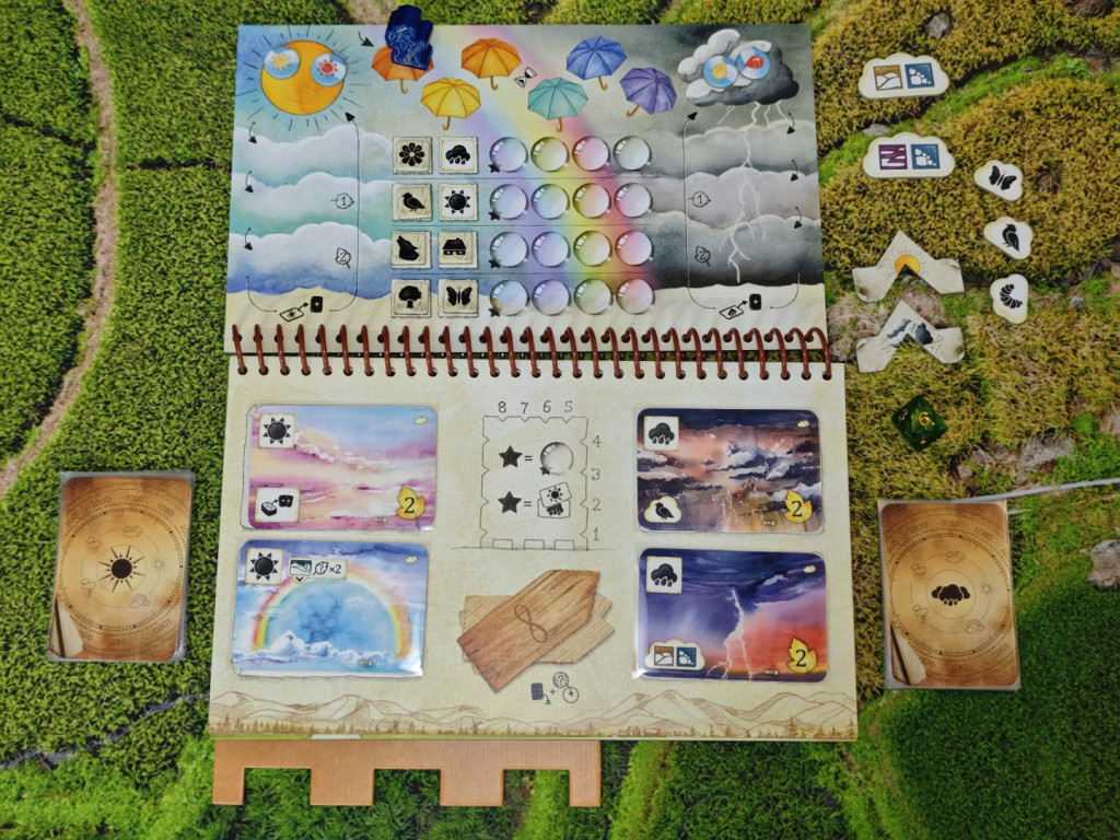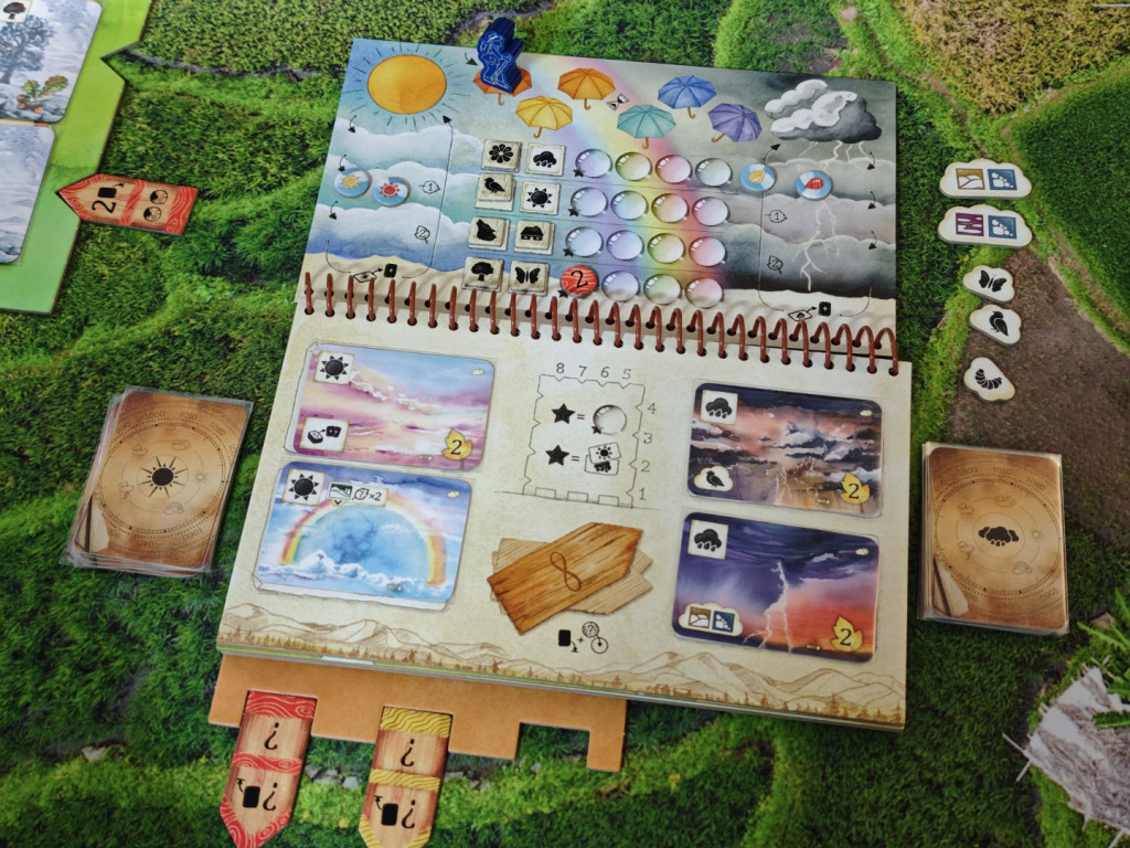 Durch das Beachten von Wetteranzeigern im Karten-Raster und das Vorrücken deiner Wetterplättchen sicherst du dir Wetterkarten. Diese schiebst du geschickt unter Landschaftskarten, um sofort wertvolle Zusatzaktionen auszulösen und Siegpunkte zu sammeln.