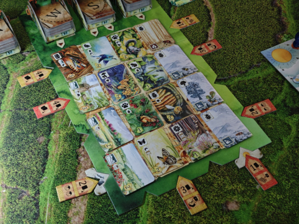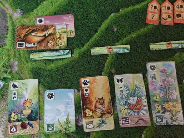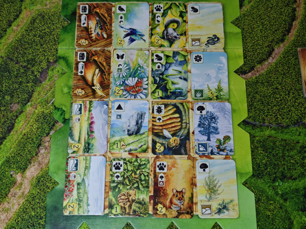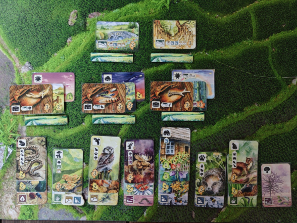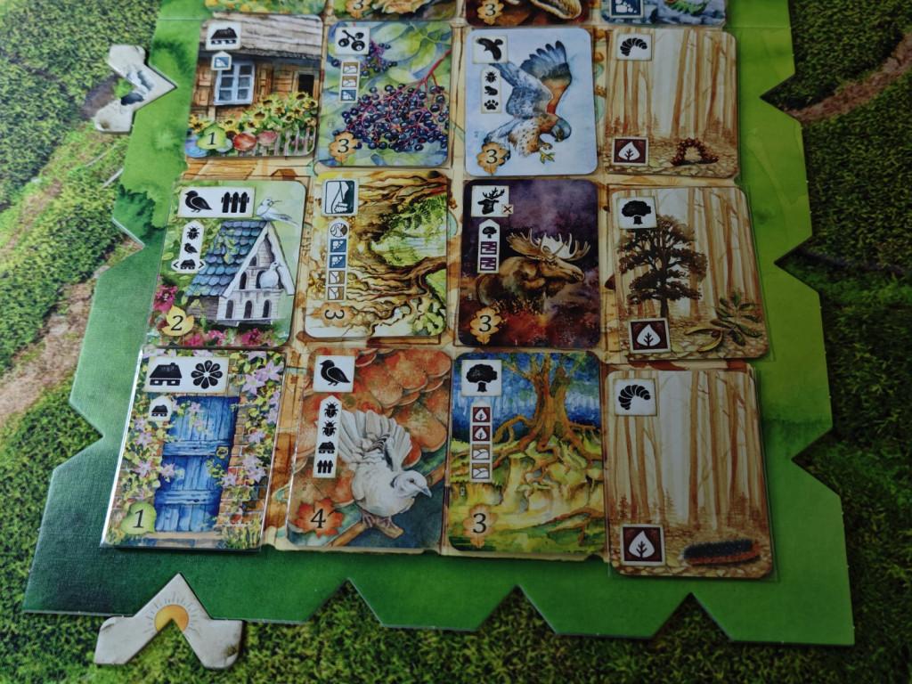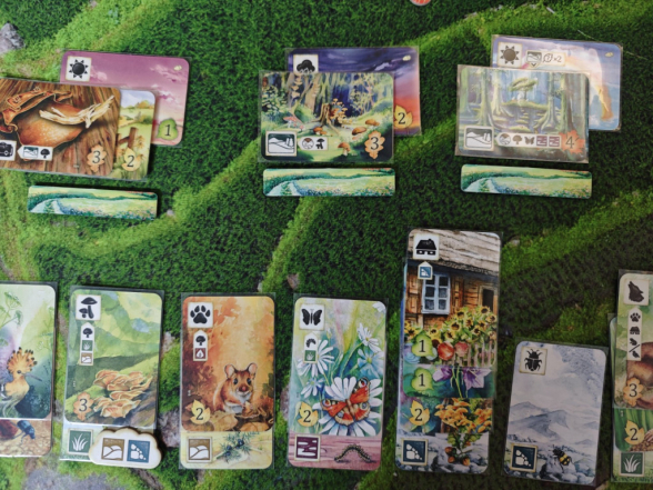 Das Ausspielen von Karten folgt bestimmten Regeln: man darf bis zu zehn Bodenkarten haben, die man nebeneinander ausspielt. Über die Bodenkarten können dann nach oben versetzt, in Spalten angeordnet passende Umgebungskarten gespielt werden, die z.B. Pilze, Bäume, Tiere verschiedener Arten oder sogar Häuser und Zäune darstellen. Ausgespielte Karten geben zwischen 1 und 4 Siegpunkte, abhängig davon wie leicht sie auszuspielen sind. Was heißt das? Das Ausspielen einer Karte ist immer an Voraussetzungen geknüpft. So gibt es einen Schmetterling, der nur auf eine Blume gespielt werden darf. Und es gibt Blumen, die nur auf Gras-Bodenkarten wollen. Andere Karten haben gleich mehrere Kartensymbole als Voraussetzungen, die alle irgendwo in der persönlichen Auslage liegen müssen, um sie ausspielen zu dürfen. So muss man sich die passenden Karten zusammensuchen, um seine Landschaft auszubauen. Der Clou: spielt man Karten übereinander, überdeckt man die Symbole der darunterliegenden Karte. Die Blume ist quasi weg, wenn man den Schmetterling darüber gespielt hat. Die Reihenfolge, in denen Karten ausgespielt werden und wohin genau, ist daher sehr wichtig und macht den Knobel-Charakter des Spiels aus.