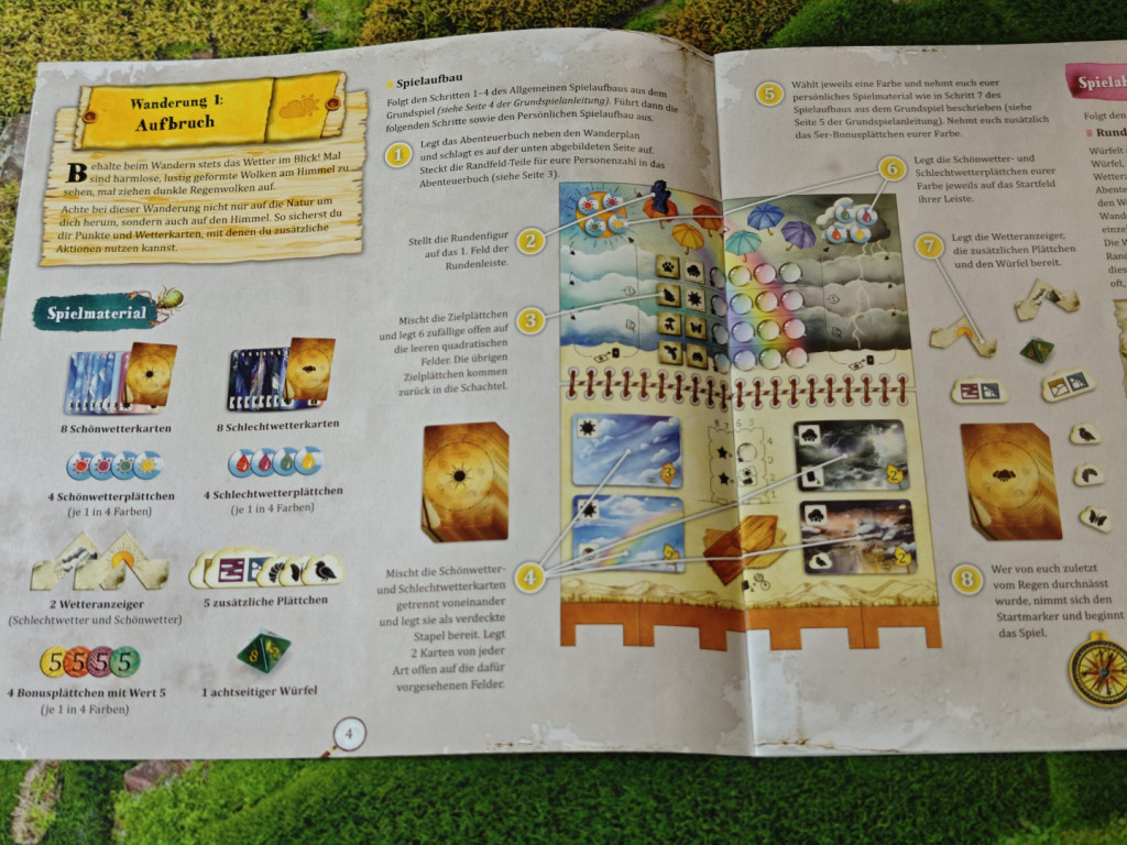 Die erste Wanderung kommt mit 16 Karten, acht Schönwetterkarten und acht Schlechtwetterkarten. Diese werden als separate Kartenstapel gemischt und jeweils zwei offen auf die vorgesehenen Felder ausgelegt. Zudem bekommt jeder Spieler ein Schönwetter- und ein Schlechtwetter-Plättchen in seiner Spielerfarbe. Es wird links bzw. rechts oben, auf die Sonne bzw. die dunkle Wolke des Abenteuerbuchs platziert. Das sind die Startfelder der entsprechenden Leisten, entlang derer sich die Plättchen bewegen. Weitere Modul-spezifische Plättchen, der achtseitige Würfel und die beiden Wetteranzeiger für Schön- und Schlechtwetter werden neben dem Abenteuerbuch bereitgelegt. Nun kann es losgehen.