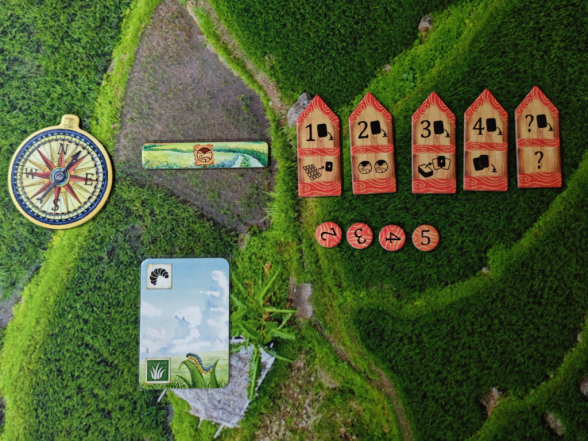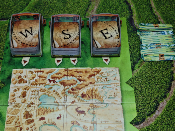 Bevor wir auf die Erweiterung das Abenteuerbuch eingehen, folgt ein kurzer Überblick über das Spielprinzip des Grundspieles Meadow: Im Reich der Natur. Meadow verläuft über 6 oder 8 Runden, abhängig von der Spieleranzahl. In jeder Runde sind Spieler im Uhrzeigersinn am Zug und verwenden jeweils eines ihrer fünf Wanderplättchen, um genau eine Aktion auszuführen. Wurden alle fünf Wanderplättchen eingesetzt, hat man also keine Aktionen mehr zur Verfügung, endet die laufende Runde.