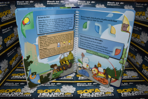 Wie bereits erwähnt, wählt man zu Beginn seinen Charakter aus und stellt die rote Scheibe so ein, dass dieser an der rechten unteren Ecke zu sehen ist. Dann beginnt man die Geschichte zu lesen. Direkt auf der ersten Seite geht es mit der ersten Entscheidung los. Hier überlegt man sich, wie man ins Rennen einsteigt. Je nachdem welche der drei Varianten man wählt, blättert man das entsprechende Drittel der Seite um. Die übrigen Seitenteile bleiben erstmal so wie sie sind. Da man nun nur noch auf einem Abschnitt der Seite unterwegs ist, sind folgende Ereignisse oder Entscheidungen so verfasst, dass man beispielsweise eine oder zwei Seiten umblättern muss und so auch einen unterschiedlichen Verlauf der Geschichte präsentiert bekommt. Nach ein paar Seiten folgt dann eine neue „große“ Entscheidung. Diese ist wieder auf einer ganzen Seite abgedruckt. So werden beim Umblättern alle Abschnitte mit umgeblättert und man kann sich wieder zwischen drei Varianten entscheiden. Je nach Situation kommen auch die drei anderen Scheiben zum Einsatz und werden auf nützliche Gegenstände oder die Gegner im Rennen gedreht. Letztere muss man natürlich im Rennen besiegen, um als erster im Ziel zu landen. So begegnet man am Ende insgesamt drei Gegnern, die in den sechsAbschnitten des Buches nacheinander auftreten. Im letzten Abschnitt geht es dann um die Auswertung, bei der man dann erfährt wie man im Rennen abgeschnitten hat. Cover & Bilder © Cover: Board Game Box / Bilder im Artikel und Teaserbild: www.sofahelden.de Das Fazit von: Born2bewild