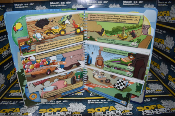Mein erstes Abenteuer - Mit Karacho zum Ziel! ist an sich kein Spiel im eigentlichen Sinne. Es ist ein sehr robustes und liebevoll gestaltetes Buch in einem Hardcover. Auf der Innenseite der vier äußeren Ecken des Buches sind jeweils Drehscheiben angebracht, die zum Spielen passend sind. Dafür sind an allen Seiten die Ecken ausgespart, sodass man je eine Stelle an den vier Scheiben sehen kann. Das Buch ist im Inneren ein Ringbuch mit gummierten und sehr kinderfreundlichen Seiten, von denen ein Großteil in drei Teile geteilt ist. Hierzu jedoch später mehr. Das Buch kommt ansonsten ohne weiteres Spielmaterial aus. Daher gestaltet sich der Spielaufbau auch einfach. Man wählt auf der roten Scheibe eine*n Fahrer*in aus und los geht’s…