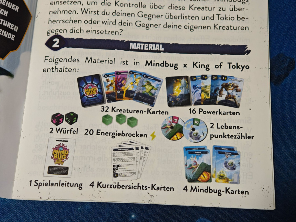 Im Vergleich zu anderen Mindbug Sets bekommt man mit Mindbug x King of Tokyo mehr für sein Geld. Zumindest was das Material angeht. Denn was wäre ein King of Tokyo Crossover ohne Powerkarten, Energie-Ressourcen und die großen schwarzen Würfel? Tatsächlich kommen diese Komponenten auch noch in genau dem bekannten King of Tokyo Design daher, unverwechselbar. Alles andere an Spielmaterial ist typisch Mindbug: man findet in der Schachtel ein Deck aus Kreaturen-Karten, die in diesem Set natürlich Figuren aus King of Tokyo zeigen. Außerdem gibt es wie immer zwei Lebenspunktezähler, in Form von kleinen Drehrädchen, und für jeden Spieler zwei Mindbug-Karten. Wer möchte, kann sich die passend designte, magnetisch schließende Deck Box dazu kaufen.