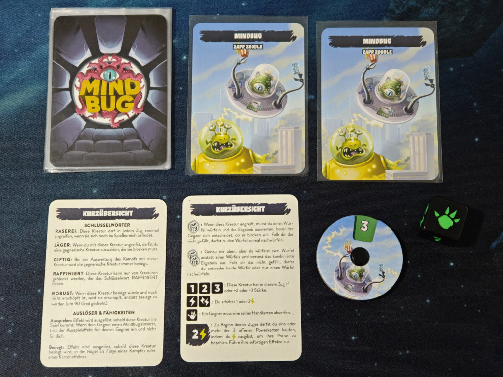 Schauen wir uns den Spielaufbau an. Wie immer erhält jeder Spieler seine zwei Mindbugs, die er offen vor sich auslegt. Will heißen: nur zweimal während einer Partie darf man mindbuggen, also eine Kreatur, die der Gegner gerade spielen möchte, klauen und stattdessen selbst ausspielen. Diese zwei Mindbugs gilt es weise einzusetzen; „Mindbuggen“ ist die Kernmechanik in Mindbug und ein wichtiges strategisches Element. Neben den Mindbugs erhält jeder Spieler im King of Tokyo Crossover auch einen Würfel. Er zeigt ähnlich wie die Würfel in King of Tokyo die Zahlen 1, 2, und 3 sowie Blitz- und Tatzen-Symbole. Nur die Herzen fehlen.