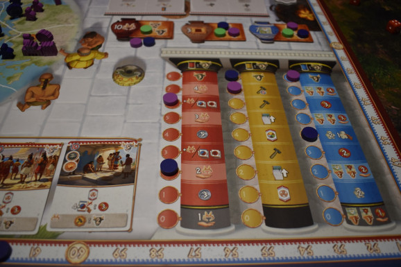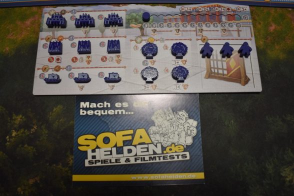 Der Spielaufbau ist relativ umfangreich. Ihr müsst natürlich den Spielplan mit der, der Spielerzahl entsprechenden Seite nach oben in die Mitte legen und die Waffen- und Münzmarker als Vorrat daneben. Alle sollten sich nun für eine Farbe entscheiden und nehmen sich jeweils das entsprechende Spielertableau und Spielmaterial. Bis auf die Soldaten und Scheiben dürft Ihr auch schon alles auf dem Tableau einsortieren. Nun sind noch einige Vorbereitungen auf dem Spielplan notwendig. Ihr müsst diverse Marker auf der Karte verteilen, Schiffsplättchen auslegen, den blauen Kartenstapel mischen und fünf Karten davon aufdecken. Dann nehmt Ihr den Stapel mit den Startkarten und sucht die raus, die Eurer Spielerzahl entsprechen. Legt sie offen hin und daneben die gleiche Anzahl an zufälligen Stammestafeln. Dann bestimmt Ihr jemanden, der Anfangen darf, sich eine Kombination auszusuchen. Diese Person darf sich nun aus den beiden Reihen eine Karte oder eine Tafel aussuchen. Die Anderen wählen dann analog zur ersten Person im Uhrzeigersinn aus den übrigen Karten oder Tafeln aus. Dann macht ihr das gleiche in umgekehrter Reihenfolge mit der anderen Auswahl. Alle nehmen sich nun die Startmaterialien, die auf der eigenen Karte abgebildet sind und stellt noch drei Soldaten in den Vorrat auf dem Tableau. Dann könnt Ihr auch schon loslegen.