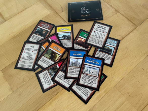 Das Spielbrett ist aus den herkömmlichen Monopoly-Varianten bekannt, doch hier fällt gleich auf, dass es weniger Felder sind. Auch gibt es keine 3er Straßenzüge, sondern jegliche farblichen Orte sind immer nur 2. Es ist also keine „geänderte“ Kopie, sondern in der Tat ein „neues“ Monopoly mit anderen Regeln und Zielen. Die Ereigniskarten heißen jetzt „Magie & Geheimnis“, die Bahnhöfe sind Portale und die Straßenkarten sind Orte, die man absichern muss (dazu später mehr). Die Vorbereitung ist allerdings genau so einfach, wie bei allen anderen Monopoly-Spielen. Jeder Spieler bekommt eine Figur und die dazugehörige Charakterkarte (kann spielentscheidend sein, denn jeder Charakter hat eine spezielle Fähigkeit), jeweils 5x10 und 5x50 Gold und es kann schon losgehen. Als Variante kann man zudem das Spiel anpassen, in dem ein Spielleiter gekürt wird, der dann ein paar Karten austauschen bzw. dazulegen kann, um so das Spiel schwerer und auch abwechslungsreicher zu machen.