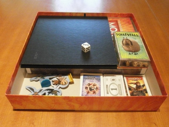 Noch vor dem Öffnen der Verpackung fällt auf, dass der Karton des Monopoly Junior - Dragons ein kleineres, kompakteres und quadratisches Format besitzt, anders als die Standard-Edition des normalen Monopoly. Ist man ins Innere vorgedrungen folgt auf die anfängliche Freude erst einmal Ernüchterung. Der Innenraum des Kartons ist nicht wie gewohnt durch Fächer aufgeteilt und ordentlich angeordnet, sondern hier wurde lediglich durch ein relativ loses Stück Karton eine Freifläche für die Spielfiguren und das Zubehör geschaffen, wo diese Teile lose umherfliegen. Auf dem Karton liegen die Spielanleitung und das Spielbrett, welches zum Spielen wie üblich aufgeklappt werden muss. Hier fallen einem sofort Größe und Aufteilung ins Auge, denn das Monopoly Junior hat je Seite nur 5 Felder plus die lizensierten Eckfelder und ist somit aufgeklappt lediglich 38x38cm groß. Das Spielbrett ist schön designt und sehr stabil und dürfte mit seiner Drachenauswahl anstelle von Straßen gerade auf kleine Drachenreiter-Fans sehr ansprechend wirken. Die Figuren sind hier ebenfalls nicht aus massivem Material sondern müssen aus einer dicken, vorgestanzten Kartonage gedrückt und auf Plastiksockel gesteckt werden. Auch die Häuser im Spiel, hier "Drachen-Trainings-Arenen" sind nur kleine Körbchen aus Plastik in der jeweils zur Spielfigur passenden Farbe. Die Drachenkarten bzw. Drachentrainings-Karten (dazu später mehr) sind aus stabilem, festem Karton, das Spielgeld, hier "Schafnoten", ist dünn, in schlichtem Weiß gehalten, einseitig bedruckt und nicht sehr ansprechend im Design. Als letzten Schritt muss man noch einen "Schafstall" aus festerem Karton zu einer Box zusammenfalten, welche später als Tresor Einsatz finden soll - eine Kartonage als ständig eingesetzte Box innerhalb des Spiels halte ich gerade bei einem Spiel speziell für kleinere Kinder etwas fragwürdig bezüglich Haltbarkeit.