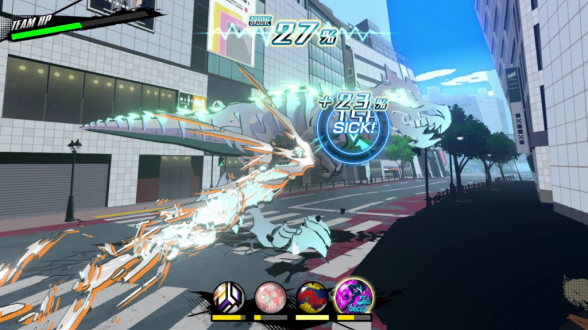 Im Kampf gegen die Noise nutzt jeder Charakter des Teams genau eine Fähigkeit, die ihm durch den jeweils ausgerüsteten Pin verliehen wird und mit genau einem Knopf des Controllers verknüpft ist. Die Kämpfe werden durch eingängigen J-Pop untermalt. Wurde eine Fähigkeit oft genug verwendet erscheint am aktiven Gegner eine ablaufende "Dreh auf!"-Anzeige. Wird der Gegner dann mit einer anderen Fähigkeit angegriffen, sammelt das Team "Groove". Sobald der Groove 100% erreicht kann eine mächtige Spezialattacke aktiviert werden und der Schaden der ganzen Gruppe wird temporär erhöht. Kämpfe können durch das Zusammenziehen mehrerer Noise auf der Straße in Serienkämpfen, sogenannten "Eskalationen", geführt werden. Hier winkt noch einmal deutlich mehr Beute und Erfahrung.