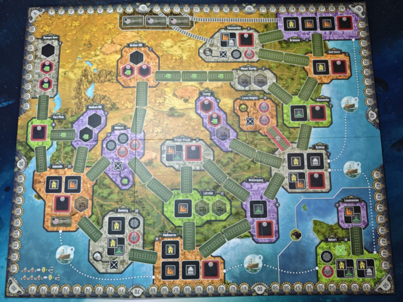 Elektrisieren: Mit dieser Aktion versorgst Du Gebäude mit Strom. Nukleum: Australien bietet in diesem Zusammenhang neue Möglichkeiten. Zum einen sind die Boote nun unerlässlich, um die von deinen neuen Kohleminen oder Uranminen produzierten Ressourcen zu den Kraftwerken zu transportieren. Die Kohleimporte sind ebenfalls angepasst: Neben Queensland kannst du nun auch Kohle aus Adelaide importieren – für 3 Thaler pro Kohle, so oft du willst. Teuer, aber manchmal notwendig. Zuletzt wartet Australien mit brandneuen Kraftwerken auf, die neue Belohnungen bieten wie z.B. dem Platzieren eines Bootes.