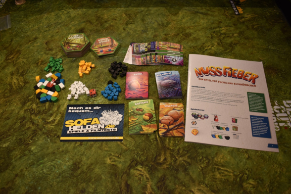 Passend zur naturnahen Thematik hätte man NussFieber vielleicht etwas nachhaltiger verpacken können. Das Spielmaterial an sich ist hauptsächlich aus Holz und Karton, lediglich der Würfel aus Kunststoff. Allerdings sind sowohl die Holzfiguren, als auch die Karten in Kunststoff verpackt. Immerhin sind die Figuren in Zipp-Beuteln untergebracht, die wiederverwendet werden können. Mit dabei sind vier Stanzbögen, aus denen Ihr die Waldfelder und den Fuchskompass befreien müsst. Die Karten sind in Folie eingeschweißt. Insgesamt ist die Gestaltung sehr gut gelungen und thematisch passend. Interessant sind aber auch die Eichhörnchen-Figuren, die pro Farbe unterschiedlich aussehen. So könnte man fast meinen, dass Spiel wäre für Farbenblinde geeignet, wären da nicht die Kobel, diese sind nämlich wiederum, abgesehen von der Farbe, identisch. Die Eichhörnchen sind niedlich und der Fuchs passt auch sehr gut ins Konzept. Er ist auch die einzige Figur, die noch mit Details bemalt ist.
