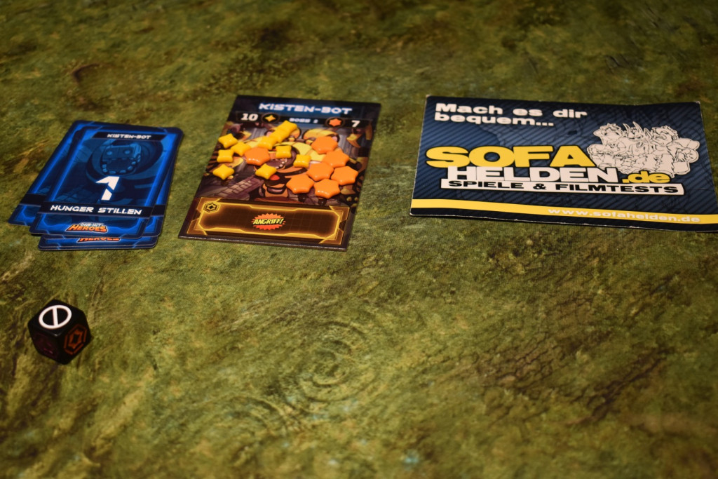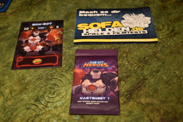 Vielleicht habt Ihr schon unser Unboxing Video zu One-Hit Heroes auf unserem Instagram-Kanal gesehen? Ansonsten erhaltet Ihr jetzt einen kurzen Überblick, was so alles in der Schachtel zu finden ist. Besonders ins Auge stechen einem die Heldentableaus. Sie bestehen aus Karton mit einer Ablagefläche aus Plastik. Irgendwie cool, vom Aspekt der Nachhaltigkeit allerdings doch nicht so richtig. Aber es passt irgendwie zum Spiel, in Richtung Beat ´em up. Ein weiterer Nachteil bei unserem Spiel war, dass sich die Ablagefläche der Energieleiste bei einem unserer Tableaus nach oben verbogen hatte. Hier werden wir nochmal mit einem Föhn oder ähnlichem nachbessern müssen. In Zipp-Beuteln findet Ihr die Schadens- beziehungsweise Aggromarker für leichten und schweren Schaden sowie die Energieanzeiger. Unter den Tableaus befinden sich die Fächer für die Boss-Karten und Tableaus sowie sechs Booster-Packs mit Karten, die Ihr im Zuge des Spiels erhaltet. Die Karten sind allesamt eingeschweißt und lassen sich nur sehr schwer auspacken, da es keine Aufrisshilfe oder ähnliches gibt. Ansonsten macht das Spielmaterial aber einen sehr guten Eindruck und auch das Inlay ist super, da die Karten hier ordentlich sortiert werden können. Auch die Fächer für die Boss-Karten sind sehr durchdacht. Generell ist uns aufgefallen, dass die Schadensmarker unterschiedliche Formen und Größen haben und die Aggro-Symbole nicht nur unterschiedliche Farben, sondern auch im Rahmen unterscheidbar sind. So dürfte das Spiel auch für Farbenblinde gut spielbar sein.