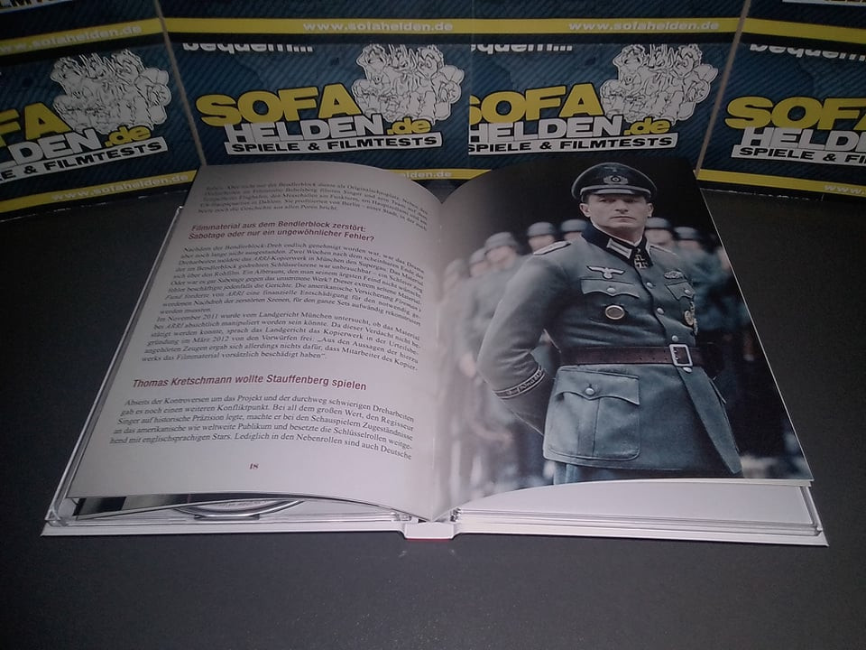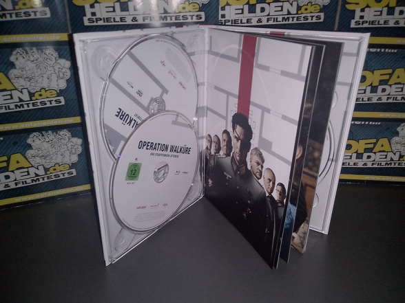 Das Mediabook der 3-Disc Limited Collector´s Edition zeigt das klassische Covermotiv des Films in Weiß. Auf der Rückseite ist eines der weltweiten Postermotive zu sehen, welches das Gesicht von Tom Cruise vor dem Hintergrund marschierender Truppen in Berlin zeigt. Während Schriftzüge und Figuren auf dem Cover durch ein Glanzfinish hervorgehoben wurden, ist das restliche Mediabook matt gehalten. Der Innendruck beschränkt sich auf eine Weiterführung beziehungsweise Abwandlung der technischen Zeichnung der Wolfsschanze, wie sie bereits auf dem Covermotiv zu finden ist. Das 24-seitige Booklet, verfasst von Carsten Baumgardt, bietet zahlreiche Szenenfotos sowie eine Menge Hintergrundinformationen zum Dreh und den damit verbundenen Schwierigkeiten. Das Begleitblatt mit den üblichen Infos und Details zu Edition wurde wie von capelight pictures gewohnt lose auf die Rückseite des Mediabooks aufgelegt. Cover & Bilder © capelight pictures OHG / © 2008 United Artists Production Finance, LLC. All rights reserved. / Produktfotos: www.sofahelden.de Das Fazit von: MarS