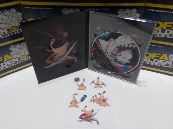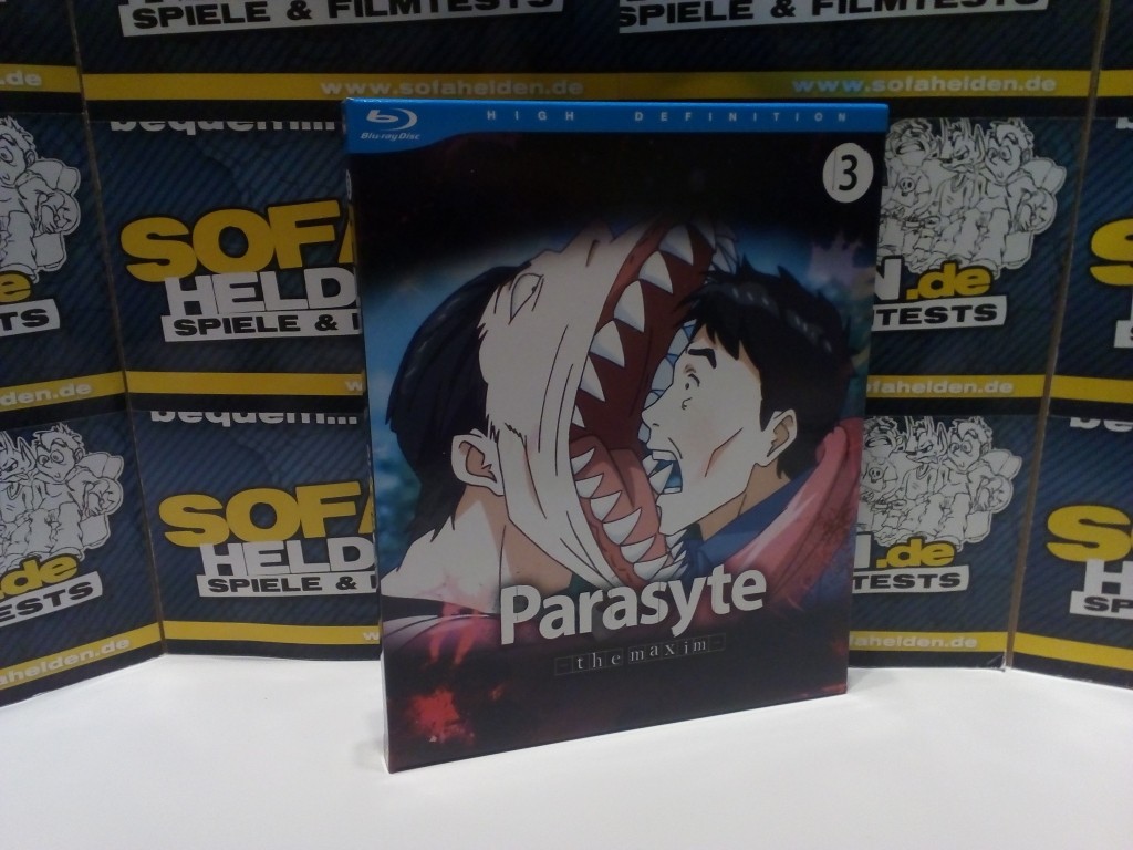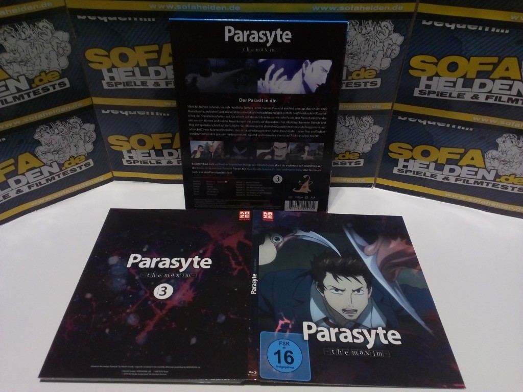 Parasyte: The Maxim - Vol. 03 erscheint passend zu den bisherigen Volumes ebenfalls im Digipak im Schuber. Das Cover des Schubers zeigt ein Bild eines Parasyten beim Fressen, welches sich wie gehabt auch auf der Disc wiederholt. Wie üblich befinden sich auf der Rückseite die obligatorischen Details zu Disc und Inhalt sowie einige Screenshots aus den Episoden. Das Digipak zeigt ein Bild von Shinichi und Migi im Kampf. Im Inneren befindet sich neben einem weiteren Bild auch ein Stickerbogen mit diversen Migi-Szenen.