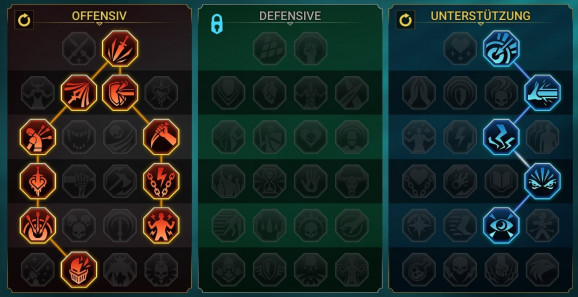 Bei den Fertigkeiten habe ich mich für den roten und blauen Fertigkeitenbaum entschieden. Durch die rote Linie macht ihr ihn nochmal um ein gutes Stück gefährlicher, besonders durch die letzte Fähigkeit. In meinem Fall habe ich Schädelhauer gewählt, denn das Ignorieren von DEF war mir bei Hurndig wichtig – hier würde sich als Artefakt auch das WILD-Set anbieten, denn in Kombination würdet ihr dann mindestens 25% der gegnerischen DEF ignorieren, mit einer 50% Wahrscheinlichkeit sogar die Hälfte! Der zweite Fertigkeitenbaum ist bei mir die Unterstützer-Seite, denn die Steigerung der Genauigkeit war mir an dieser Stelle sehr wichtig. Wer ihn ohne seinen Debuffs spielen möchte, dem empfehle ich allerdings die defensive Seite, da man ihn dadurch ein wenig robuster machen kann.