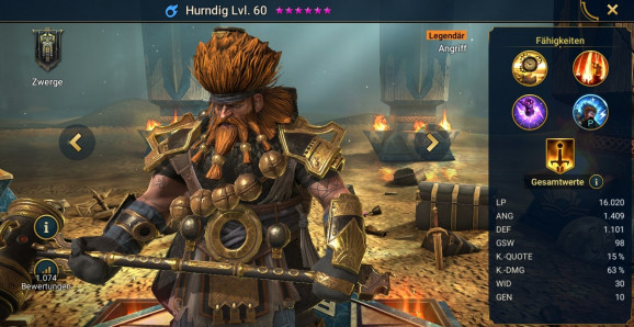 Das Design von Hurndig ist den Machern von Raid-Shadow Legend wieder einmal sehr gelungen, denn er sieht sehr gut und detailreich aus. Seine Haarpracht lässt zwar eher auf einen Frisör als auf einen knallharten Kämpfer deuten, aber sein Hammer und sein Raketenrucksack zeigt dann das Gegenteil auf. Er ist ein Angriffs-Champion aus der Kategorie Magie (blau) und musste aus vier neuen epischen Champions fusioniert werden. Die Arbeit hat sich gelohnt, denn er ist eine Waffe und sollte in keiner Sammlung fehlen. Da ich in meiner Sammlung noch kein richtiger Angriffs-Champion hatte, war es für mich ein Muss, bei dieser Fusion mitzumachen. Ihr könnt Hurndig in vielen Bereichen spielen und wer ihn nicht gemacht hat, aber im Nachgang aus einem Splitter zieht, kann sich glücklich schätzen. Nicht nur, weil er ordentlich Schaden macht, sondern weil er als Allrounder auch in vielen Bereichen sehr wichtig ist.