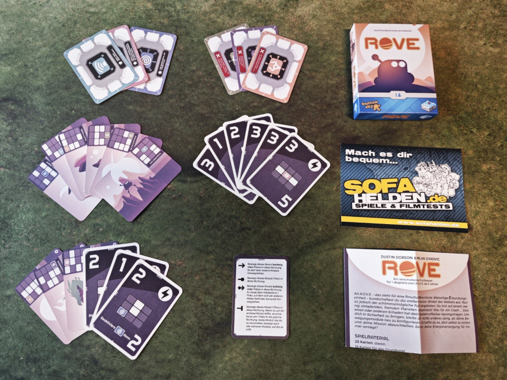 ROVE ist ein kleines, geniales Puzzlespiel für eine Person. Es gehört zu der Frosted Mini Reihe und schafft es, aus nur 18 Karten eine herausragende Spieltiefe zu erzeugen! Zu den 18 Karten des Grundspiels gehören eine Übersichts-, zwölf Missions-/Bewegungs- und sechs Modulkarten. Alle Karten sind auf Vorder- und Rückseite verschieden bedruckt. Zudem gibt es die kleine Erweiterung „Faszinierende Flora“ mit sechs neuen Missions-/Bewegungskarten, die direkt im Spiel enthalten ist.